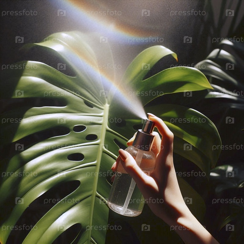 Счастливый родитель растения тушит свое большое листовое растение Монстр стеклянной бутылкой, Ai generated image