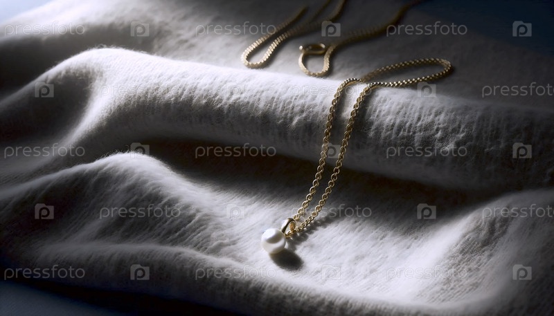 Дисплей минималистического ожерелья: деликатная золотая цепочка с единственным жемчугом, лежащая на кровати из сырого серых меховых тканей, Ai generated image