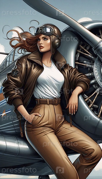 Пин-ап девушка в роли пилота, опирающегося на винтажный пропеллер самолета Ai generated image