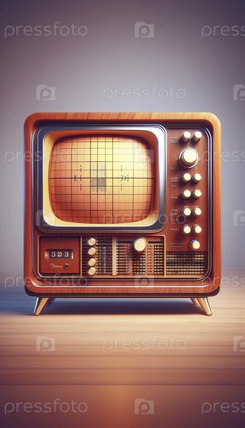 Телевизор из деревянных панелей с большим, выпуклым зеленым экраном и рядами аналоговых циферблат Ai генерирует изображение