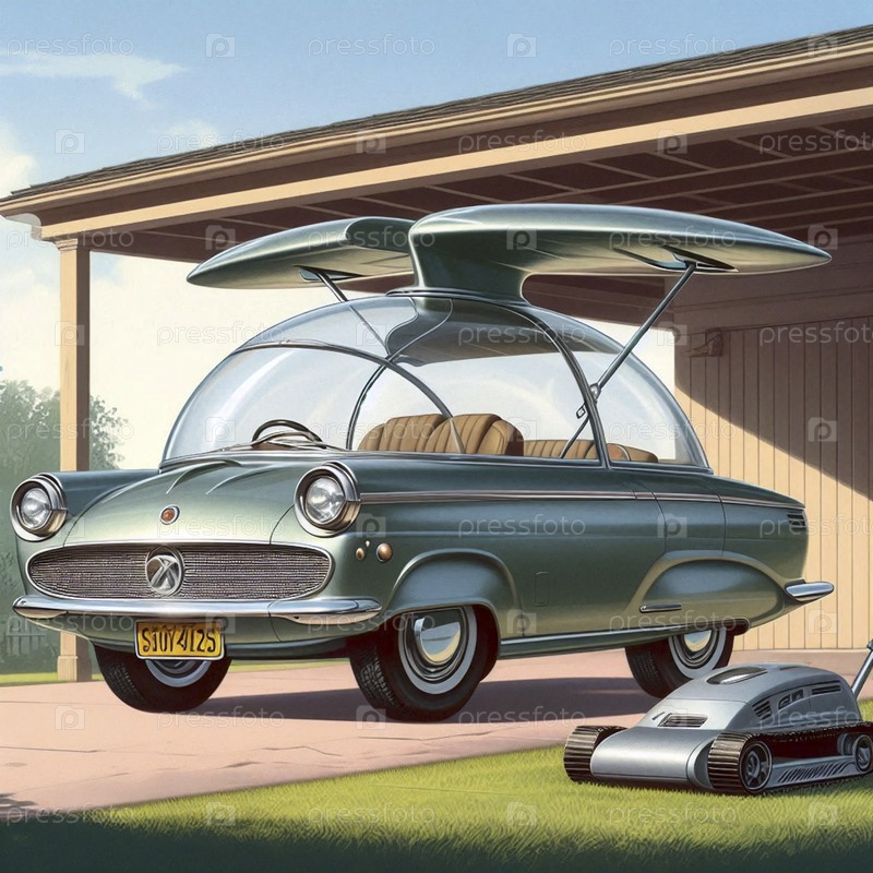 Семейный аэрокар с выдвижными крыльями и пузырьковой кабиной, припаркованный на пригородной парковке, Ai generated image