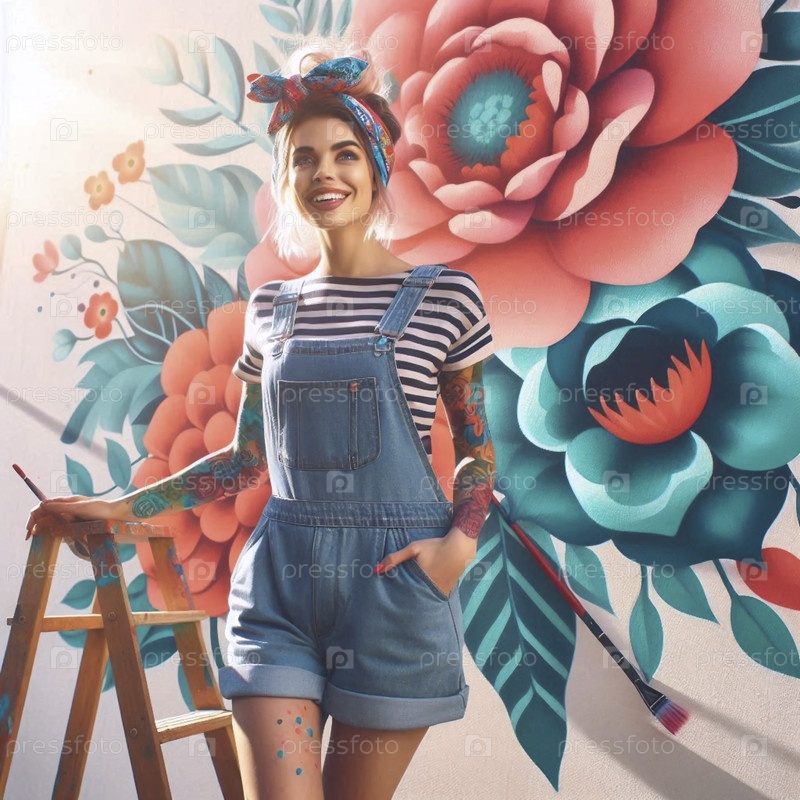 Девушка, нарисованная в качестве художника, украшающего большую стену цветочной росписью, Ай создала изображение