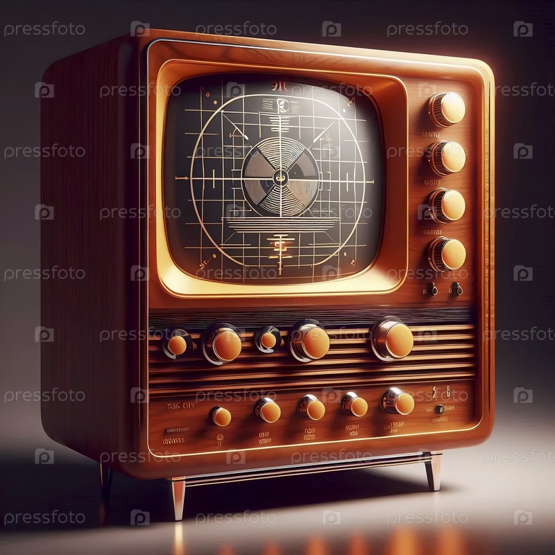 Телевизор из деревянных панелей с большим, выпуклым зеленым экраном и рядами аналоговых циферблат Ai генерирует изображение