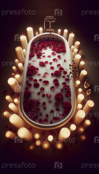 Роскошная, пенящая ванна с молоком, листьями роз и свечами для абсолютного расслабления, Ai generated image