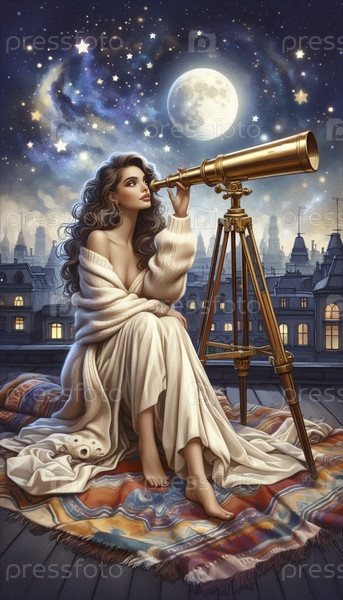 Пин-ап девушка с телескопом, наблюдающая за звездами со крыши дома, Ai generated image