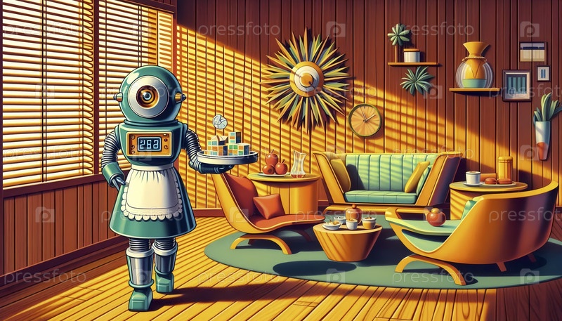 Домашний робот с головой купола и фартуком, подающий завтрак в затонувшей гостиной, Ai generated image