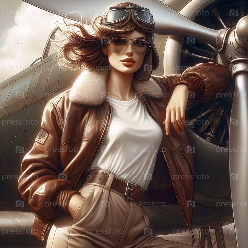 Пин-ап девушка в роли пилота, опирающегося на винтажный пропеллер самолета Ai generated image