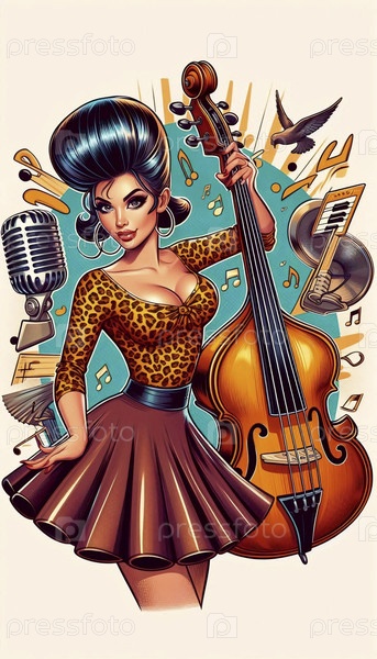 Пин-ап девушка, одетая как певица рокабилли со стенд-апом бассом, Ai generated image