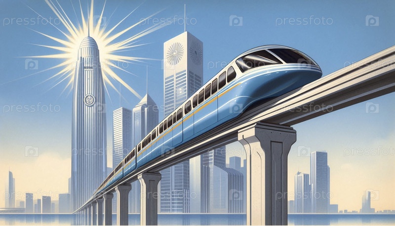 Оптимизированный монорельсовый поезд, плавающий тихо по одной поднятой дорожке через футуристический центр города, Ai generated image