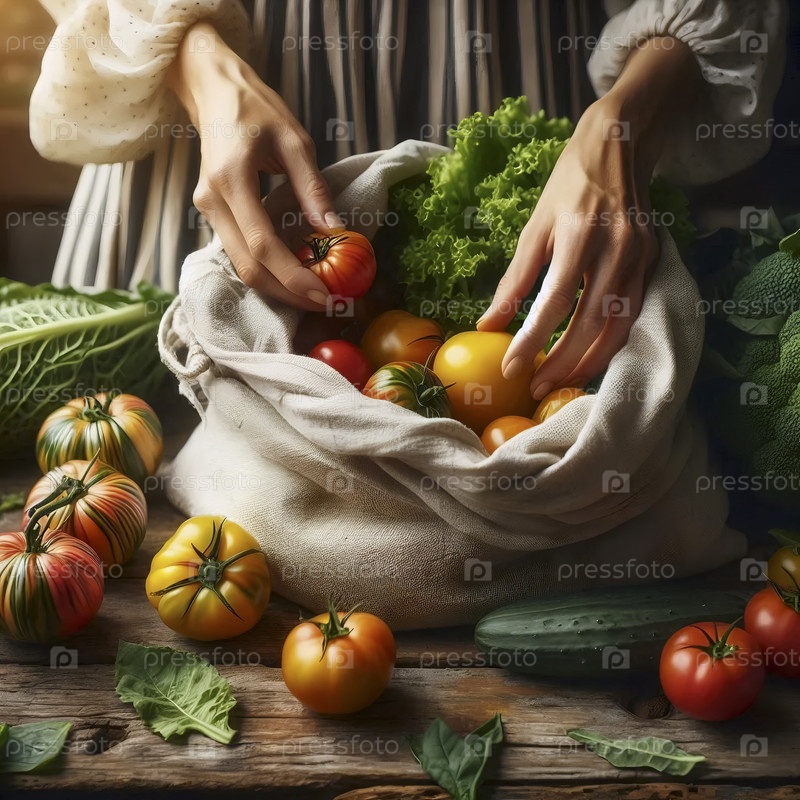 Момент устойчивой жизни: руки, использующие многоразовый льняной пакет на киоске фермерского рынка, Ai generated image