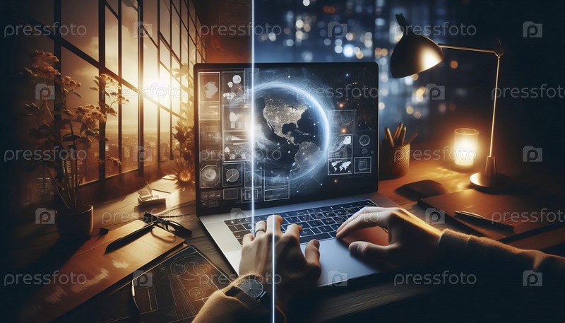 Виртуальное соединение удаленных команд сделано физическим: руки на клавиатурах в разных часовых поясах, изображение AI