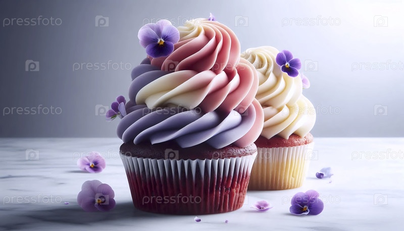 Стол из трех вкусных, безупречно замороженных кексов с небольшим количеством съедобных цветов на мраморной плите Ai создал изображение