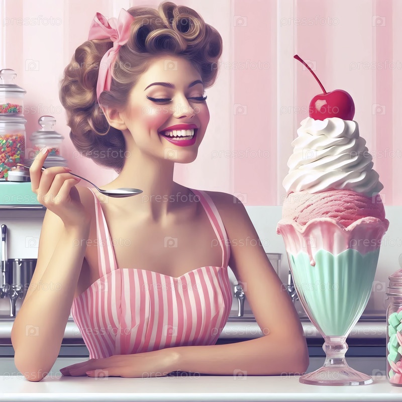 Пин-ап девушка наслаждается гигантским мороженым с удовольствием, Ai generated image