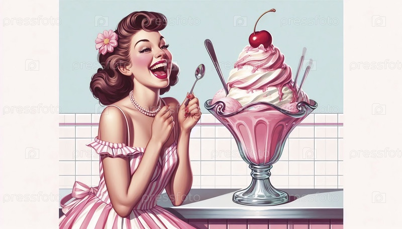 Пин-ап девушка наслаждается гигантским мороженым с удовольствием, Ai generated image