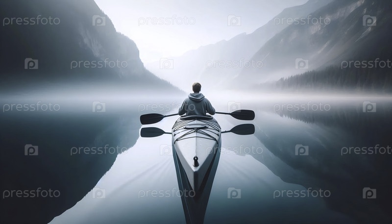 Каякер мира, скользящий по зеркально-спокойному озеру в туманное утро, Ai создал изображение