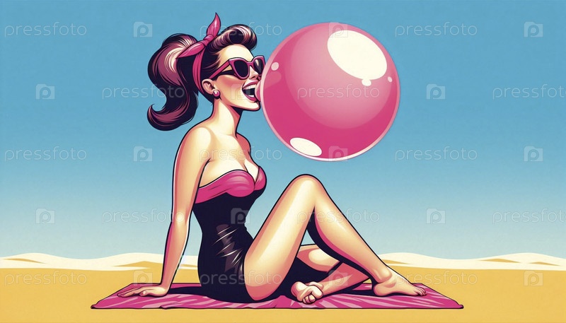 Пин-ап девушка в купальнике дует гигантский пузырь из жвачки, Ai generated image