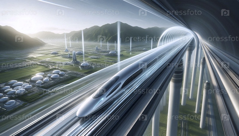 Высокоскоростной вакуумный поезд, стреляющий через прозрачную трубу по панорамному ландшафту, Ai generated image