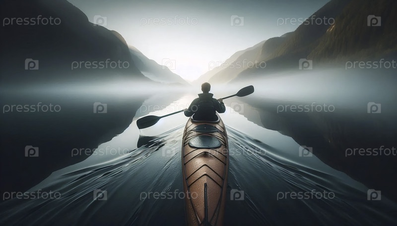 Каякер мира, скользящий по зеркально-спокойному озеру в туманное утро, Ai создал изображение