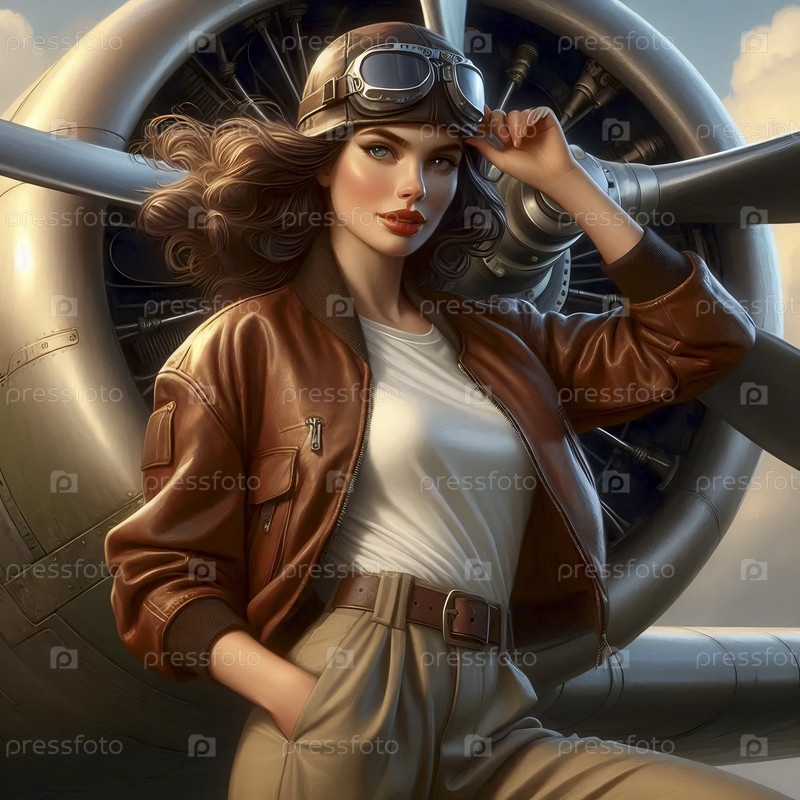 Пин-ап девушка в роли пилота, опирающегося на винтажный пропеллер самолета Ai generated image