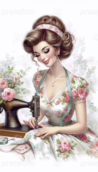 Девушка, нарисованная в качестве швеи на старинной швейной машине, Ai generated image