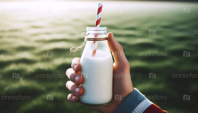 Ближайший план руки, держащей прозрачную стеклянную бутылку с молоком со смелой красно-белой бумажной соломой, Ай создал изображение