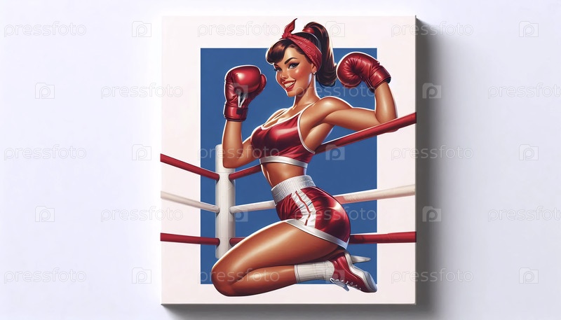 Пин-ап девушка в боксерских перчатках в классической позе борьбы, Ai generated image