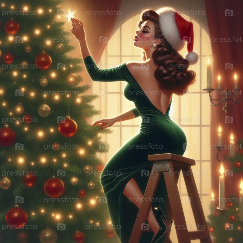 Рождественская девочка с пин-апом украшает дерево в шляпе Санты, Ai generated image