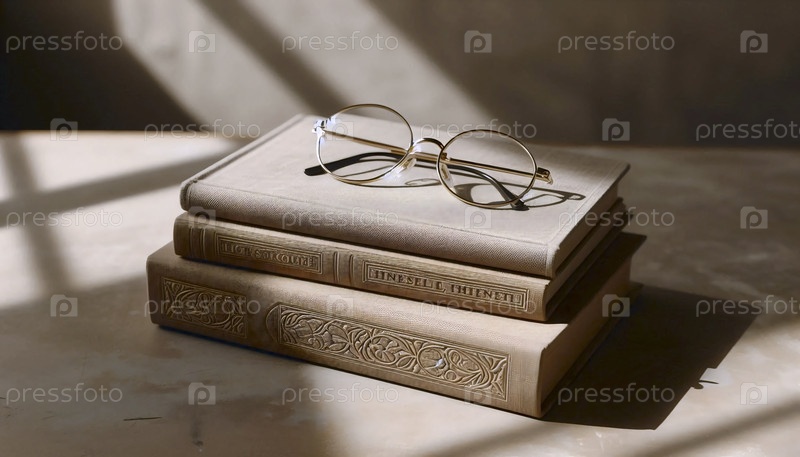 Стол из трех красивых книг в жесткой обложке с текстурированными крышками и парой круглых очков на вершине, Ай создала изображение