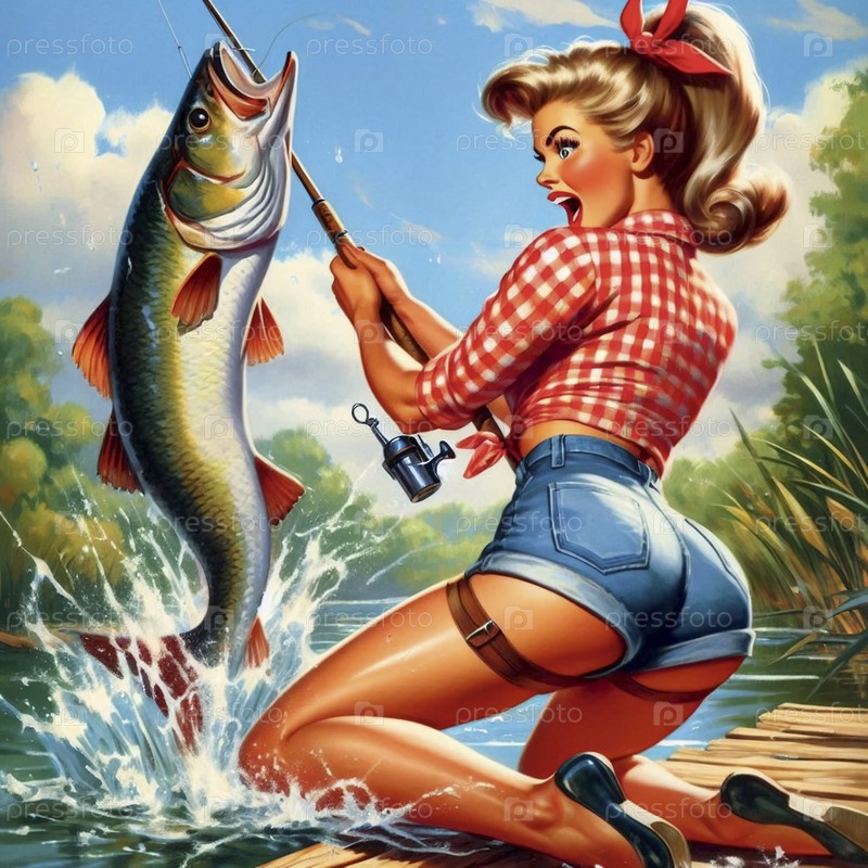 Пин-ап девушка с удочкой, колеблющаяся в большом улове, Ai generated image