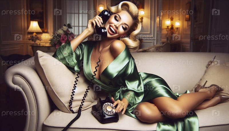 Пин-ап девушка на старом телефоне, ведущая сплетнический разговор, Ai generated image