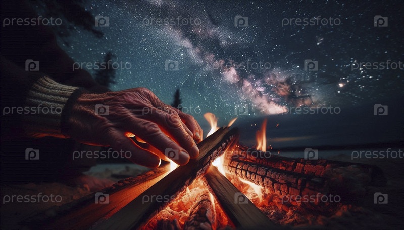 Момент одинокого размышления во время кемпинга: руки, зажигая костер под звездным небом, создали изображение