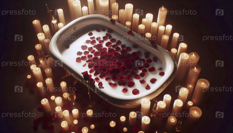 Роскошная, пенящая ванна с молоком, листьями роз и свечами для абсолютного расслабления, Ai generated image