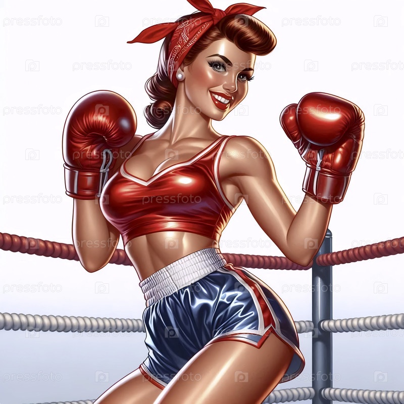 Пин-ап девушка в боксерских перчатках в классической позе борьбы, Ai generated image
