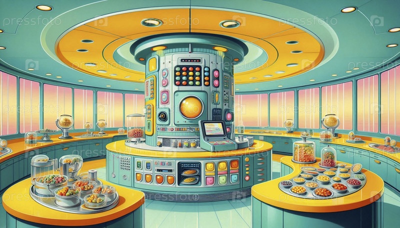 Винтажная кухня будущего с центральной консолью управления и автоматическими приборами для доставки пищи, Ai создал изображение