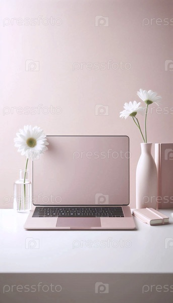 Минималистическое рабочее пространство с пастельно-розовым ноутбуком, одной ромашкой в стакане и изящным блокнотом, Ai generated image
