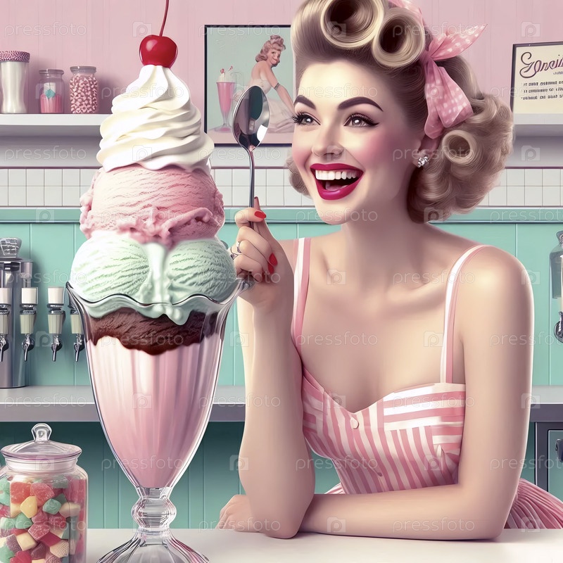 Пин-ап девушка наслаждается гигантским мороженым с удовольствием, Ai generated image