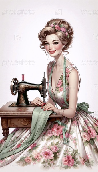 Девушка, нарисованная в качестве швеи на старинной швейной машине, Ai generated image