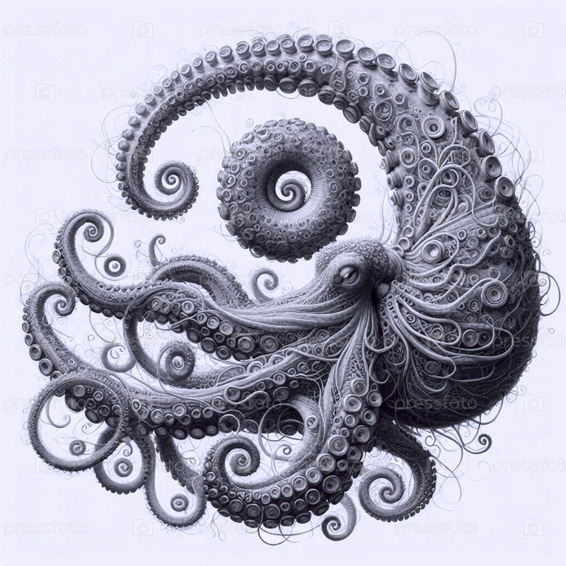 Detailed Octopus A ink drawing art print, Ai generated image Подробный чернильный рисунок осьминога художественная печать, созданная изображением