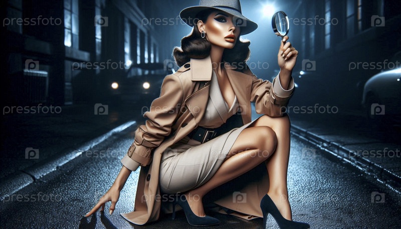 Девушка-принтер в роли детектива с увеличительным стеклом, расследующей подсказки, Ai generated image