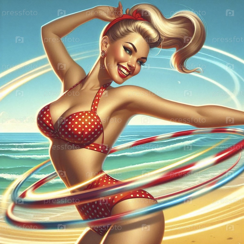 Пин-ап девушка в купальнике с точки полки, играющая на пляже, Ai generated image