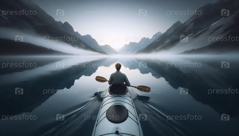 Каякер мира, скользящий по зеркально-спокойному озеру в туманное утро, Ai создал изображение