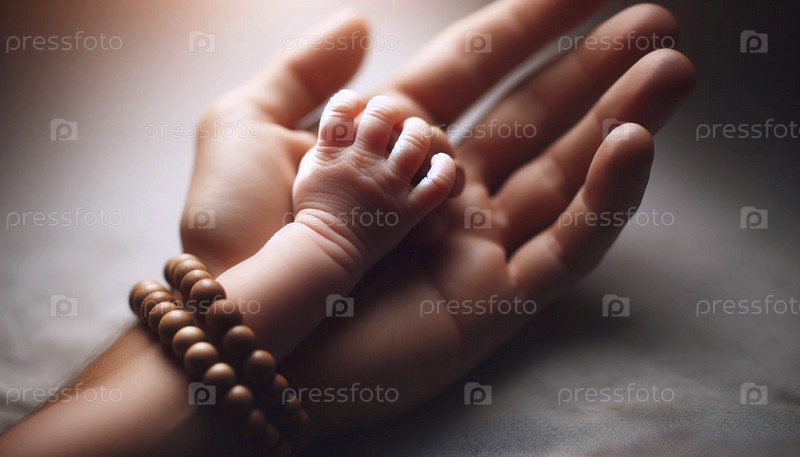 Крошечная рука ребенка хватает за палец взрослого, оба украшены простым браслетом с соответствующими бусинками, Ai generated image