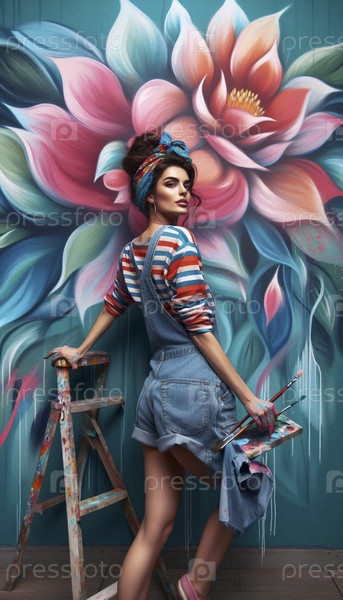 Девушка, нарисованная в качестве художника, украшающего большую стену цветочной росписью, Ай создала изображение