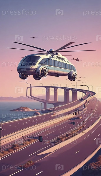 Шпионский автобус для пригородного транспорта с роторами, летящий над узкой прибрежной автомагистралью на закате, Ai generated image