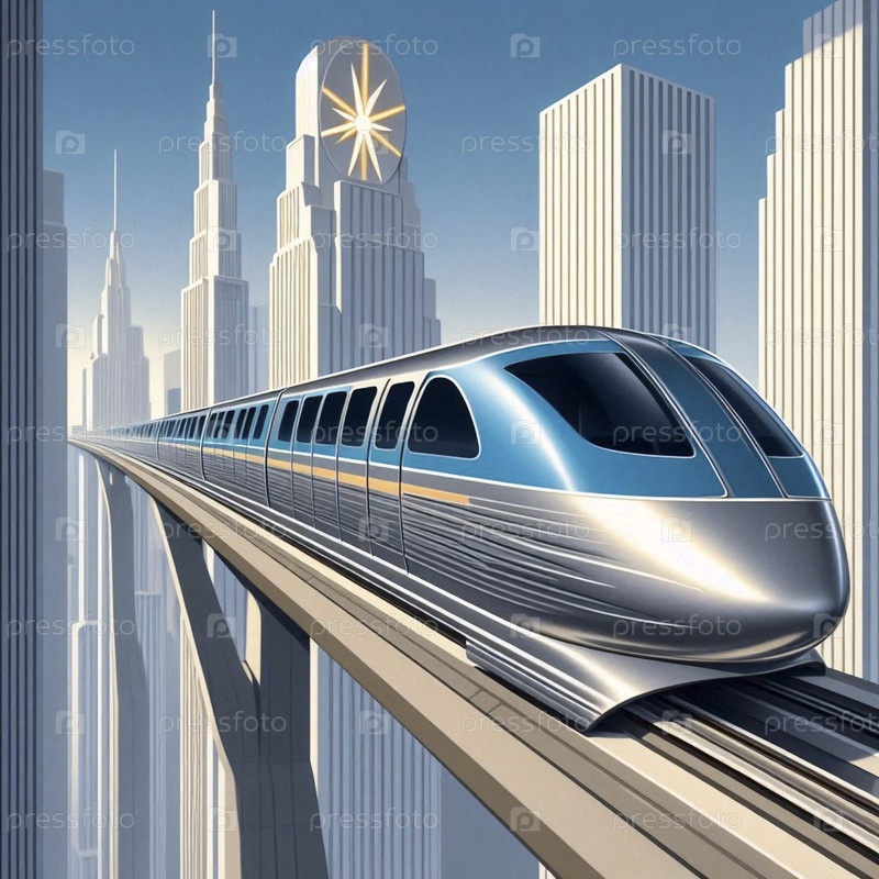 Оптимизированный монорельсовый поезд, плавающий тихо по одной поднятой дорожке через футуристический центр города, Ai generated image