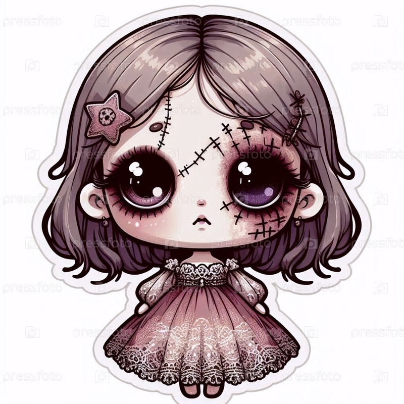 Милый стикер кавайи с разбитой куклой со швамами, Ai generated image