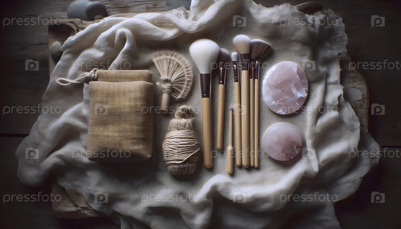 Массив чистых, устойчивых инструментов красоты на льняной ткани: бамбуковые кисти, мешок из сизаля, металлический гуа-ша, Ai generated image