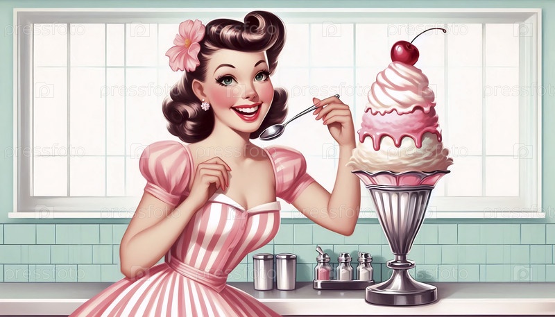 Пин-ап девушка наслаждается гигантским мороженым с удовольствием, Ai generated image