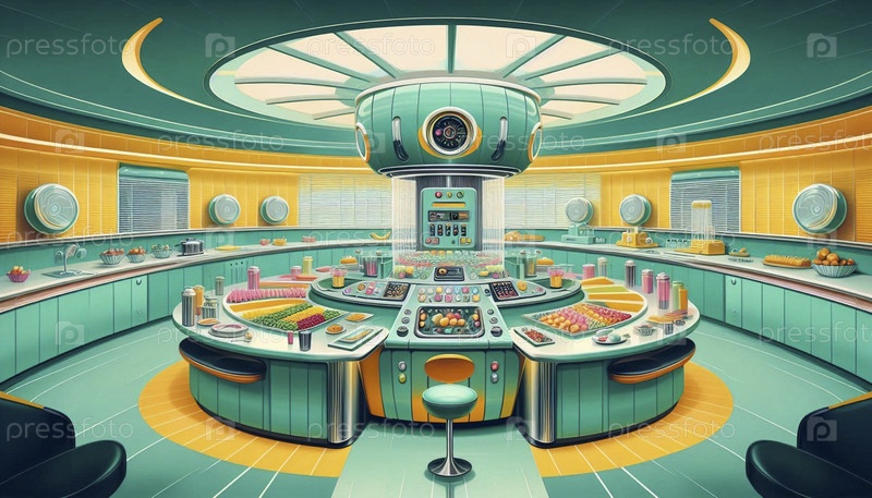 Винтажная кухня будущего с центральной консолью управления и автоматическими приборами для доставки пищи, Ai создал изображение