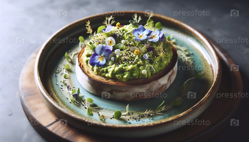 Небольшой круглый тост из авокадо с съедобными цветами и семенами кунжута на ручной керамической тарелке, Ai generated image